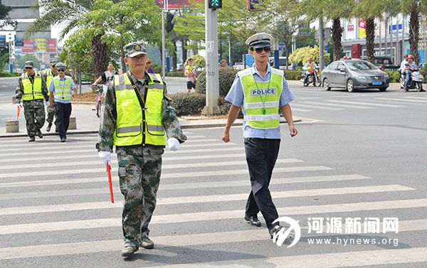 党员志愿者与交警一起走上街头,开展文明交通劝导活动。