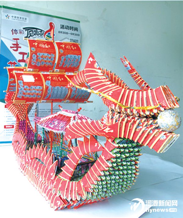 要从近百件精美的作品中选出优胜 者,由手工艺从业者专业顾问、业主代表 和彩民代表组成的评审团挑花了眼,最 后,“龙舟竞渡”仅仅以一票的优势胜出。 “龙舟竞渡”以“中国红”票种为主体, 搭建龙头、龙身、龙尾和船帆,大胆的使 用“红”色素材,让整个作品色调鲜艳活 泼而充满喜庆,又贴合中国传统情感;同 时,辅以“十倍幸运”、“甜蜜蜜”等其他票 种,数种颜色合理搭配,显得层次分明而 和谐一体。