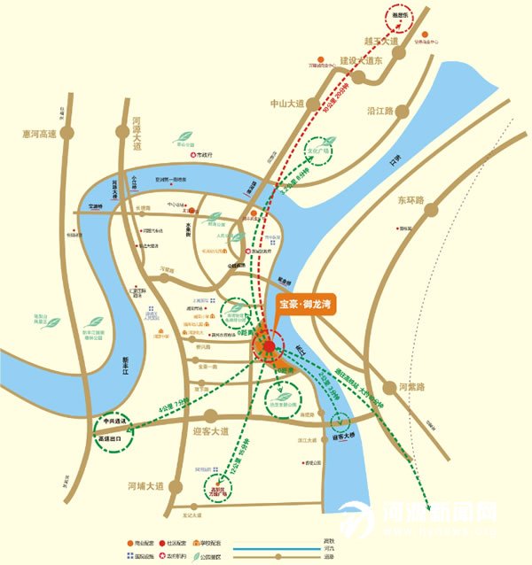 涵盖了高铁站、码头、客运站、公交站的河源城南交通枢纽位于宝豪·御龙湾东南侧,经项目东侧的滨江大道横跨迎客大桥十分钟即可到达,密集的交通路网让置业者与繁华片刻对接。同时,项目周边配套醇熟,自身配套有沿街商业、游泳池、健身休闲场所、会所、幼儿园、小学等,让置业者的幸福生活一步到位,共谱未来美好蓝图。