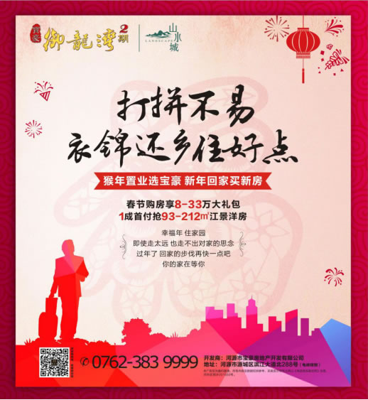 对于在大城市漂泊久了的游子而言,经过努力拼搏后虽然在大城市里有一隅可立足,但是住的始终是租来的房子,所以内心深处对这个偌大的城市还是少了一份归属感。寒冷的冬日,谁不想有个温暖的居所?孤寂的冬天,谁不想窝在家中享受家庭的甜蜜幸福?宝豪·御龙湾静候游子归来,让爱不再流浪,让爱回家过年。