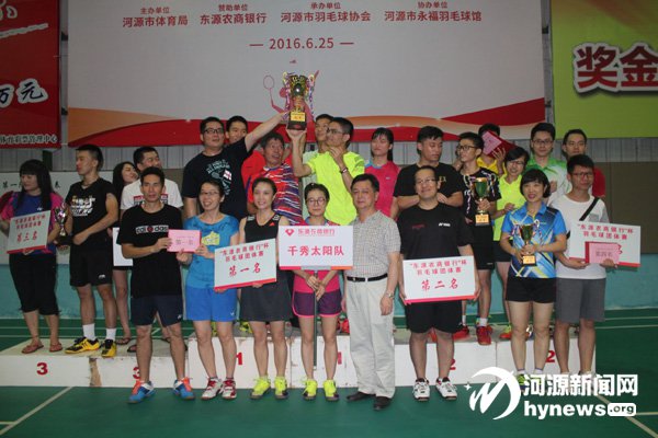 6 月25 日至26 日,由我市市体育局主办,市羽毛球协会承办,东源农商银行赞助的“2016 东源农商银行”杯羽毛球团体赛在永福羽毛球馆顺利举行。来自我市五县一区24 支代表队的200 余名羽毛球爱好者参加了比赛。经过两天的激烈角逐,千秀太阳队摘得桂冠、千秀星星队及文昌一队分别获得亚军和季军。