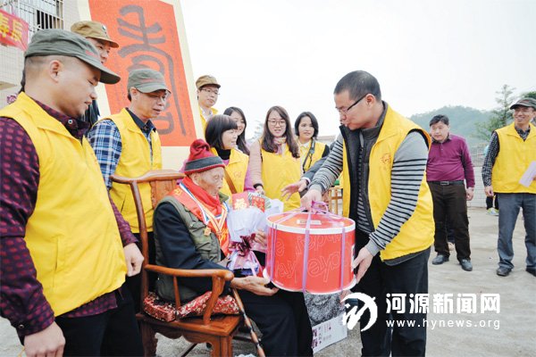昨日,河源关爱抗战老兵志愿者团队、河源好人互助联合会等40 多名志愿者来到和平县优胜镇石坝村,为抗战老兵宋顺祥庆祝108 岁生辰。当日,志愿者们带去了生日蛋糕、鲜花、慰问品及社会爱心人士的慰问金等,并为老人敬献鲜花、寿字匾,与老人共进寿宴,听老人讲述抗战事迹。