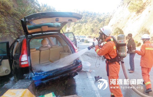 17 日14 时50 分左右,紫金消防中队接到报警称,河紫路鸡公嶂路段一辆私家车撞上路边山体并冒烟。该中队立即出动3 辆消防车15 名官兵赶赴现场救援。