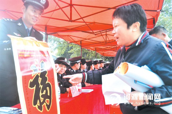 民警在110宣传日向市民宣传禁毒知识,派发禁毒挂历。