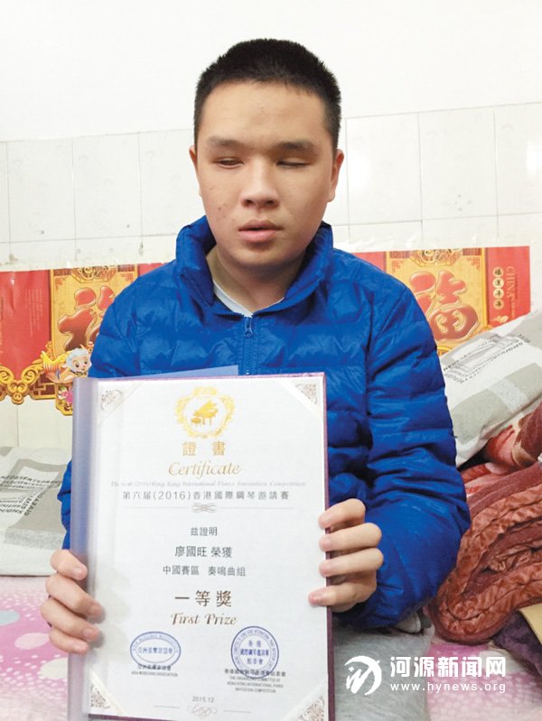 每次廖国旺登台,妈妈赖春英都陪在身边,搀扶着他坐在钢琴面前,而后退出舞台。每一次比赛,廖国旺从没让妈妈失望,而他刚刚参加的第六届(2016)香港国际钢琴邀请赛广州赛区的比赛也不例外,在这次比赛上,廖国旺获得了钢琴组冠军,成功夺下到香港参加国际钢琴总赛的入门券。