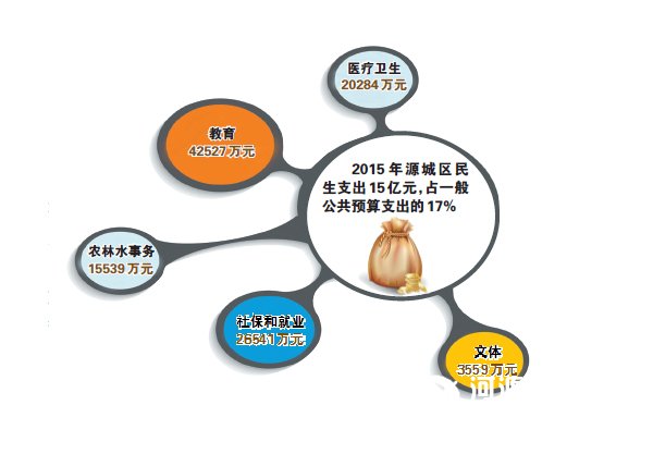 “十二五”时期,源城区致力保障和改善民生,2015 年民生领域支出是2010 年的3 倍。教育、医疗、卫生、就业、养老、住房等基本民生和底线民生工作成效显著。特别在教育上,累计投入11.2 亿元,新建学校13 间,改建学校35 间,新增学位26100 个,实现教育强镇全覆盖。