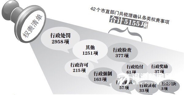 经过近4 个月的梳理、审核、确认,市政府工作部门权责清单近日正式形成,待权责清单公布后,群众只需根据自身需要,登录市政府门户网站及其工作部门网站、网上办事大厅、办事窗口等,即可随时检索查询42 个市直部门的行政许可、行政处罚、行政强制、行政征收等9+N 类共5155 项行政事项。以此为标志,我市简政放权、深化行政体制改革取得了重大进展和积极成效。