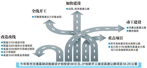 “十二五”时期,我市交通建设完成投资 255.7 亿元,其中高速公路通车里程增加 145 公里、在建里程291 公里,汕湛(紫金段)、大广(连平段)高速建成通车,实现“县县通高速”。尤其是去年,我市交通建设投入资金100.21 亿元,为历史新高,同比上一年增长50.8%。