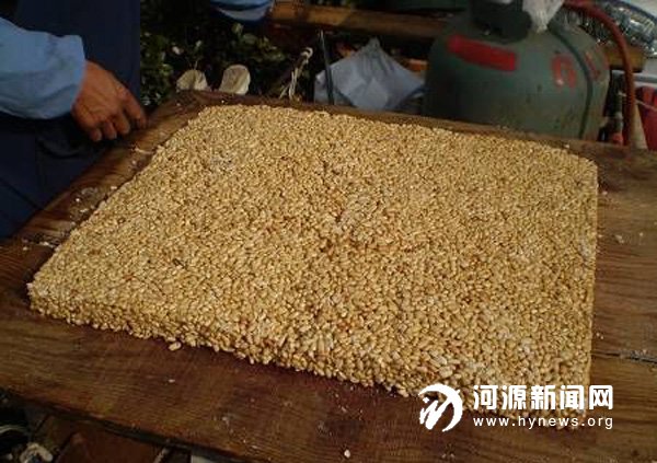 百里不同风,千里不同俗。在河源地区,炒米糕也叫打米散。前些年,因有事到东源上莞,偶遇喜爱收藏的上莞中学徐老师。他家里收藏了旧时常用的客家物件。他拿着一个格子框说,这就是过年打米散用的。长年累月的使用,格子框虽略显陈旧,仍发出熠熠光辉。徐老师说,制作炒米散过程不简单,要先把糯米放大饭锅里蒸熟,然后放在太阳下晒,后再把糯米放入锅里翻炒,趁热往锅里放油和饴糖,后把炒熟的米散倒入案板上的格子框中,冷却后,把格子拿开,炒米糕就可以吃了。听着徐老师那娓娓动听的讲述,我仿佛嗅到了那甜甜的炒米糕味道。