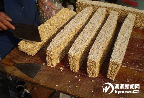 搅拌好的米花和糖要进行碾压、平整,直至米花和糖紧紧地粘合在一起了,这样放置一会妈妈就会把它再切成小块。此时的我们早已垂涎三尺。妈妈看着这帮口水不停咽的小屁孩就会把切好的米糕给我们每人一块,在场的小孩全有份。我们拿着米糕高高兴兴咬着,咔嚓咔嚓的脆响和我们的嬉闹声在那时刻成了最动听的音乐。