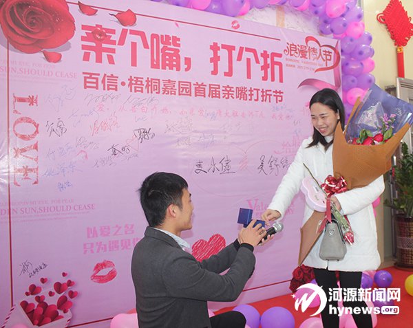 情人节期间,已经有多对情侣参 加了百信·梧桐嘉园“亲个嘴打个折” 浪漫情人节活动,用不同姿势的吻为 自己赚到了万元购房款。而百信·梧 桐嘉园也兑现了承诺——只要姿势到 位,折扣低到流泪。在吴先生的求婚 后不久,一对来自江东新区的金婚夫 妻也来到现场。在其他客户的鼓励 下,75 岁的吴叔向妻子叶姨献上玫瑰, 含蓄地表达了爱意。