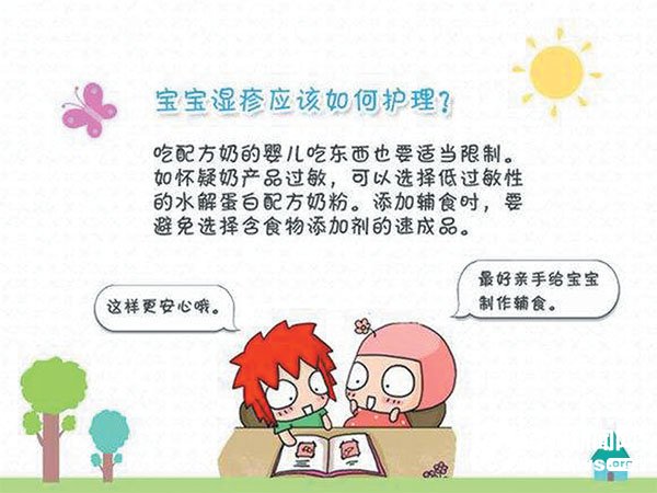 宝宝的湿疹跟其自身的过敏体质 有很大的关系,所以要尽量让宝宝避 免接触可能引起过敏的物质。对于尚 未开始添加辅食的小婴儿来说,最常 见的是牛奶蛋白过敏。对于牛奶蛋白 过敏的小婴儿,如果是人工喂养的,需 暂停现用的配方奶粉,试改用部分水 解蛋白配方奶粉、深度水解蛋白配方 奶粉;如果是母乳喂养的,妈妈应注意 避免食用引起宝宝过敏的可疑食物。