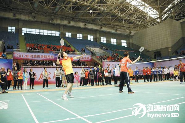 1 月9 日,我市金融系统“河源农商行杯”羽毛球赛在市体育馆开幕。本次比赛由市金融工作局、人民银行河源市中心支行、河源银监分局牵头组织,市金融系统文化体育联合会、市金融系统青年联合会、河源银行业公会联合主办。来自全市金融监管部门、银行、证券、保险等机构共21 支队伍参加比赛,赛期共3 个月。比赛旨在通过比赛增进金融机构之间相互学习与交流,推进我市金融系统精神文明建设。