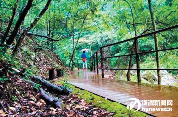 数千米的峡谷蜿蜒曲折的从景区出 口到顶端大瀑布,峡谷里有着近10 座形 态各异的木桥,这在石台乃至皖南并不 多见。更不多见的是,桥桥各不相同,景 区内的工作人员称之为“十桥九貌”,说 法十分贴切。行走在峡谷的栈道里,看 清洁工扫也扫不完的落叶。花开亦美, 却抵不过落叶之美。