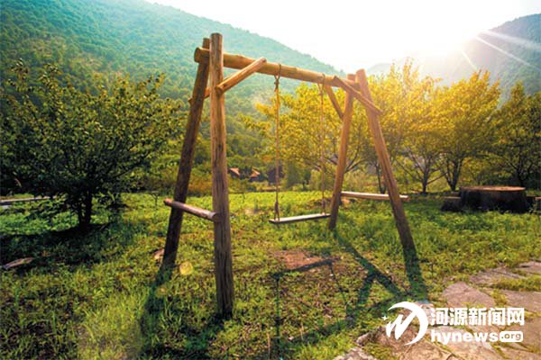 到达醉山野的第一道风景是入口处 的自然景观,依山而建的木屋别墅镶嵌 在山边。“未觉池塘春草梦,阶前梧叶已 秋声”,池塘边安静的秋千等待着客人的 摇晃、池塘里古老的水车在不温不火地 转着,仿佛老者向远道而来的人叙述着 醉山野的过去故事。