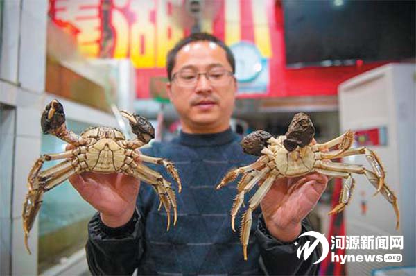 如果是秋冬季节来到溱湖,溱 湖簖蟹就是最不能错过的佳肴啦, 看这簖蟹块头多大,两只一只重六 两,一只五两。这种大只的相对比 较稀缺,价格会高一些,如果是自 己家里吃,买3.5-4 两左右的就足 够啦。