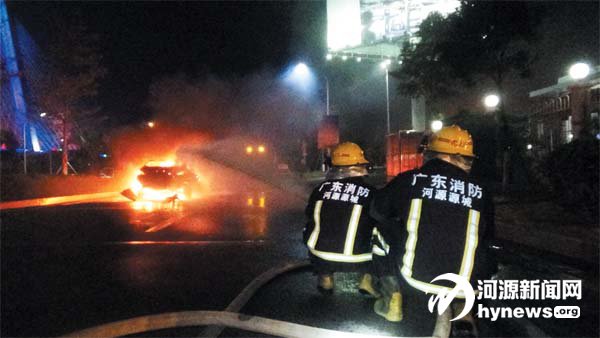 前日18 时14 分,源城 消防中队接到指挥中心调 度命令称:迎客大桥桥下有 一小车自燃。接警后,消防 官兵迅速赶往现场。到达现 场后发现,一辆私家车正猛 烈燃烧,无人员被困。根据 现场情况,消防官兵出动水 枪对火势进行扑救,15 分钟 后,现场火势被成功扑灭。