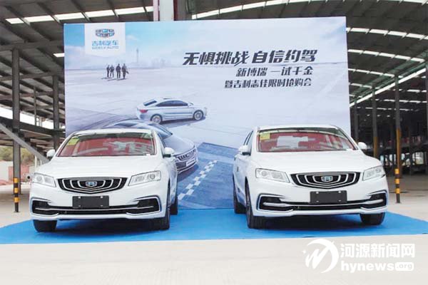 本报讯 记者 苏远龙 25日下午, 吉利汽车河源志佳4S店在一通国际汽 车城盛大举行的“无惧挑战自信约驾 新博瑞一试千金”试驾会圆满落幕,众 多车主客户们以及河源主流媒体朋友 们见证并体验了新博瑞以及博越的独 特魅力。