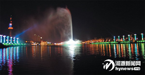 悦耳的音乐声已响起,河边上有很多 人,男男女女,老老少少,双双对对,人声鼎 沸起来。我面前江面上霓虹灯闪烁,已有 水花跌跌撞撞的样子。不,它是在跃跃欲 试。那里就是亚洲第一高喷?是的,亚洲 第一高喷就在河源。没错!没错!我掐准 时间也算不了那么准时啊!时间上赶得那 么巧合,不差分秒。