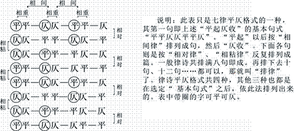 这三个定律可以简单说作:句 内平仄相间,联内平仄相对,联间平 仄相粘。联合起来,就形成七律的 一种平仄格式,如(表一)。