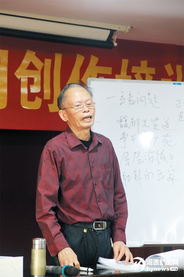 讲座中,这个80 多岁的老前 辈,授课3 个小时结合自己丰富 的创作实践和理论探索对中国古 典诗词的音韵知识、旧体诗体式 等内容进行了介绍,给河源市诗 词爱好者提供了一个学习、交流 平台,对诗词爱好者创作起到一 定的指导和规范作用。
