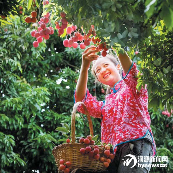又到一年荔枝成熟时,红彤彤的果实映 红了摘采姑娘的笑脸。