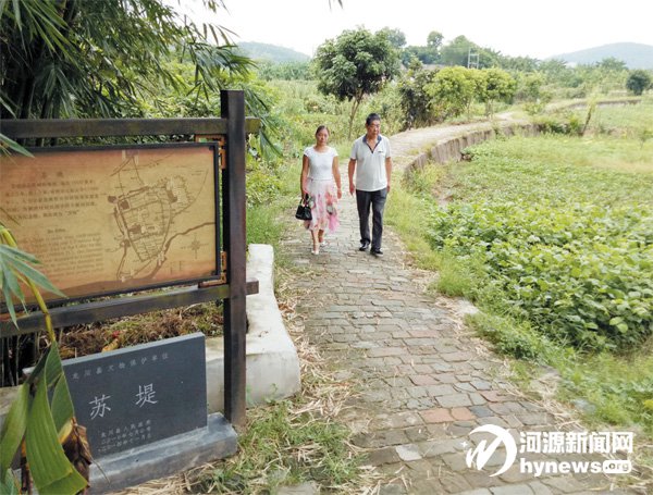 漫步苏堤,如同穿行在历史丛林深处,仿佛脚下的每一块砖石都能发出古老的回音,这从铺设苏堤的一些砖条就可以见证。记者在现场看到,现存苏堤约1000 米,堤外墙石砌,横断面呈梯形,中间用沙土夯实。堤高 2.5 米、顶宽2 米、底宽6 米,面铺鹅卵石,令人惊讶的是,苏堤的砖条上还有汉字,上面隐隐约约有一些字迹。当地村民说,这些砖条意味着这道苏堤的施工都有完善的备案,原材料的供应等也记载清晰。