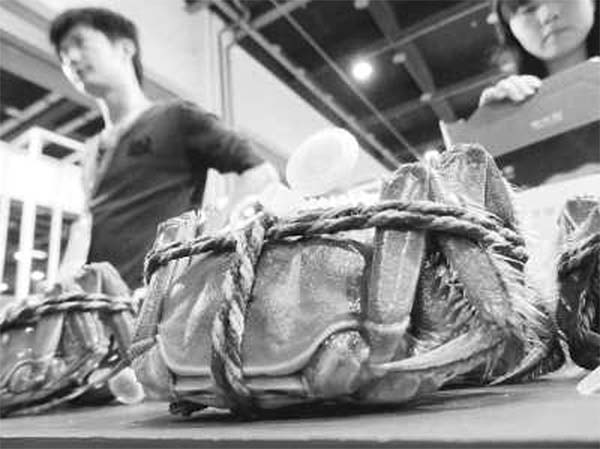 “在市场上买螃蟹,上面绑的皮筋足足有二两,150 块一斤的 螃 蟹 ,皮 筋 就 压 秤 30 多 块 ,明 目 张 胆 地 合 理 、合 法 化 了吗?”近日,有消费者在微博发出这样的疑问。虽然买螃蟹扎草绳已是行业潜规则,但绑绳比 重 如 此 大 还 是 让 人 难 以 接受。为了一探究竟,记者近日走访了北京市内几家较大的海鲜市场。