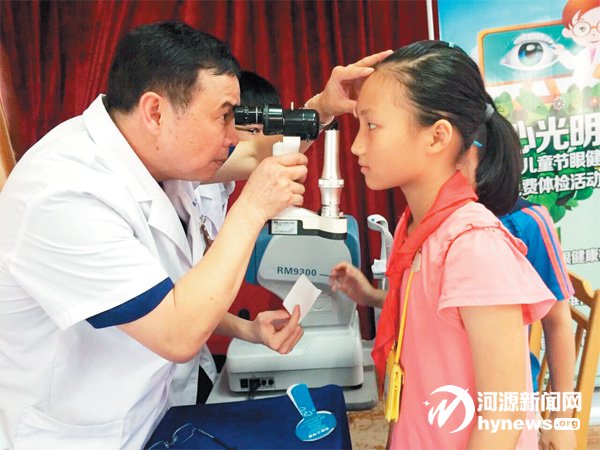 河源光明眼科医院屈光中 心主任杨得雄率领医护人员为 近100 名学生进行了视力测试、 眼底检查、医学验光等眼健康体 检,并派发护眼手册等眼健康知 识宣传资料。检查完成后,河源 光明眼科医院对检查对象免费 出具了《青少年视力健康普查报 告单》,并表示对有近视、弱视、 散光等眼科问题的学生给予优 惠矫正或治疗。