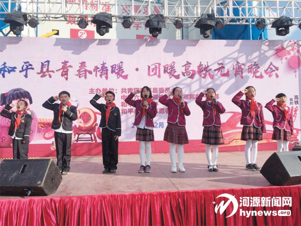 2018年,阳明二小红领巾朗诵队参加共青团和平县委员会举办的“青春情暖·团暖高铁元宵晚会”少先队献词。