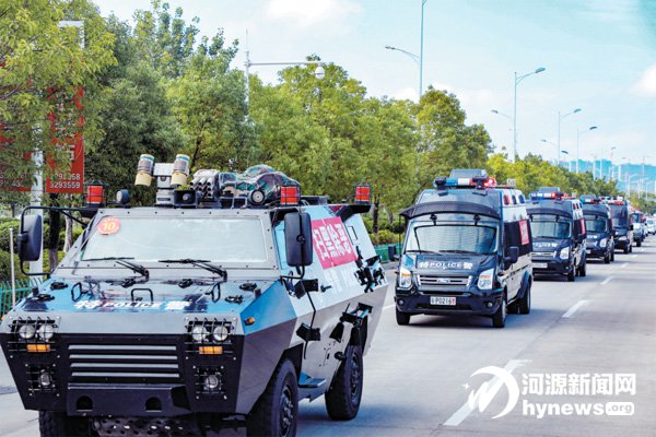 在市及源城区的武装大巡游活动现场,由32台各类警车组成的公安武装巡游方队从老城中山公园出发,经珠河桥、文化广场、沿江西路、新河大道、205国道、河源大道、迎客大桥、东环路、胜利大桥、东江首府南门线路巡游。同时,由200名干警、100名机关干部、100名志愿者共400人组成的徒步巡游方队从源城区中山公园出发,沿珠河桥、沿江路、市会议中心路线巡游。巡游展示了河源警方的昂扬斗志和威武风采,展示扫黑除恶工作队伍团结一致、众志成城的良好形象,以及向全市人民表达扫黑除恶专项斗争必胜的信心和决心。