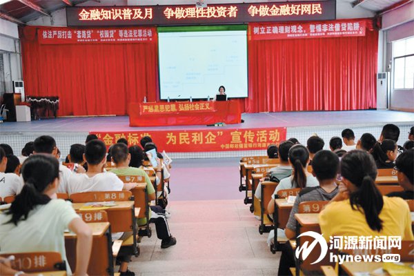 为做好金融知识普及月活动,积极履行社会责任,促进校园金融的稳定健康发展,近日,邮储银行城区支行联合源城区金 融局、源城公安分局到东埔中学开展“金融知识进校园”讲座活动。活动得到了市银保监分局与市人行金融消协的大力支持, 相关领导亲临现场指导并邀请电视台对活动进行了录制。讲座以“提升在校学生金融知识”为目的,充分宣传非法校园贷、套 路贷、手游诈骗等的特征及危害,同时向师生们普及银行卡、防范电信诈骗、防范非法集资基础金融防范知识。