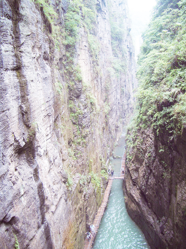 再往下走,溪旁石山壁立、翠色流溢。峡谷深处,忽然“地拔双崖起,天余一线青”。两边石壁以90度的直角垂直竖立,如两道坚固的石墙相对危耸,远观似古镇小巷。不过穿过这小巷的不是青石小径,而是激泻的瀑流。但见那一路欢畅奔流的溪水在这里突然被挤进深凹的石道,从落差几十米的石坡上直冲而下,激流飞溅、轰鸣振耳。