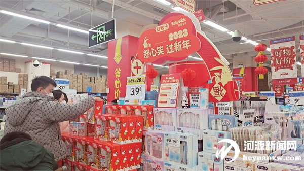 记者走进万隆城沃尔玛超市,看到各式各样的年货摆在两旁,春联、福字、利是袋、灯笼等将超市衬托得格外喜庆。糖果、饼干、牛奶、水果、饮料等年货琳琅满目,前来置办年货的市民络绎不绝,消费情况十分火热。记者看到,市民除了购买常见的糖果、饼干及各式礼盒、礼包,还会挑选购买厨具、玩具等其他物件。“过年促销力度比较大,趁着有优惠把家里用了多年的厨具也更换一下,用新的厨具做年夜饭心情会更好。”市民陈先生说道。