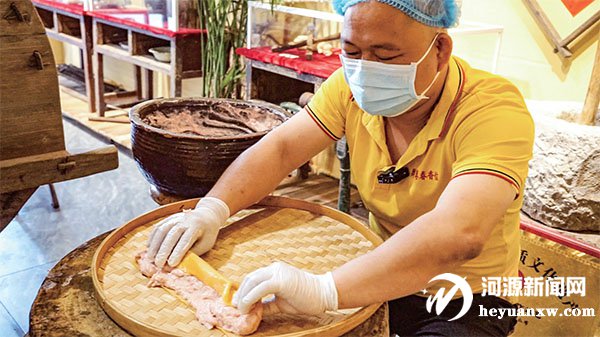 在龙川客家人的味蕾记忆中,卷春最能代表家乡的味道。作为龙川县非物质文化遗产,雅寄卷春制作技艺历史悠久,起源于清末。卷春采用新鲜猪后腿肉,历经“剔除肥肉、捶打、搅拌肉馅、裹春皮”等工序后蒸煮而成,其色泽金黄、清甜爽口,富有弹性,切开呈圆形,寓意“春春车车,团团圆圆”。