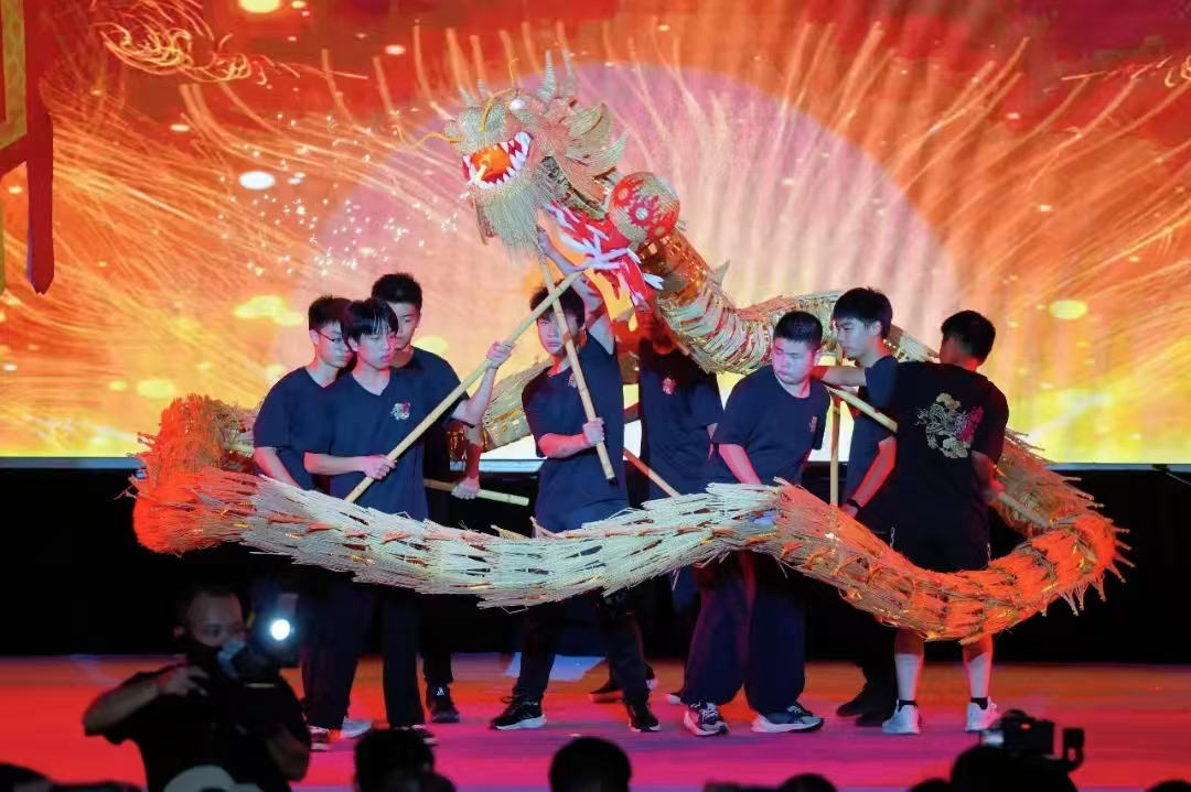 开场节目《追龙少年》瞬间点燃现场气氛。河源理工学校的猫头狮队与上莞少年香火龙队联袂演出,锣鼓声、呐喊声交织,狮子的憨态可掬与火龙的灵动矫健相得益彰,传统文化与青春活力碰撞出别样火花,台下观众掌声雷动。紧接着,客家童谣《月光光》缓缓响起,熟悉的旋律勾起许多人童年的回忆,大人小孩跟着轻声哼唱,温馨氛围弥漫全场;广场舞《饮灯酒》节奏欢快,舞者们身着客家服饰,动作整齐划一,生动还原了客家人办喜事时“饮灯酒”的热闹场景,让游客直观感受客家民俗文化;情景朗诵《一封家书》中,演员分别扮演阮啸仙与家人,三名学生分别深情朗诵家书内容,字里行间满是家国情怀与思念之情,感动了不少观众;村民自编自演的舞蹈《小雨》更具创意,背景屏幕播放着苏家围荷花池的美景,撑伞游园将乡村的诗意与浪漫展现得淋漓尽致。