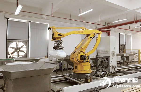 在上料区域,一台五轴机器人熟练地将袋装原材料抓取并运至料槽上方,通过机械手开袋,将原料准确倒入槽中。聚盛模具总经理雷霆介绍,该设备为公司自主研发成果,经多年技术积累而成,不仅显著提高工作效率,也解决了原材料频繁搬运的难题。这台机器人可24小时不间断运行,即便在无照明的“黑灯”环境下仍能稳定作业。