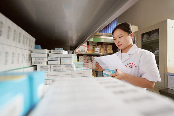 河北省柏乡县龙华镇卫生院药房工作人员在为患者取药。