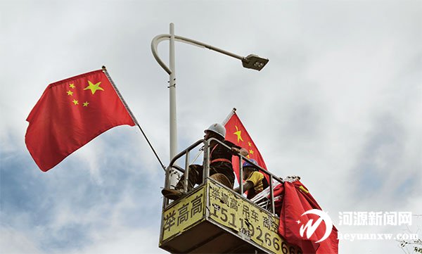 近日,在市区沿江路路段,工作人员正搭乘高空作业车辆,认真细致地将国旗悬挂在指定位置,一面面五星红旗迎风招展,国庆喜庆氛围浓厚。
