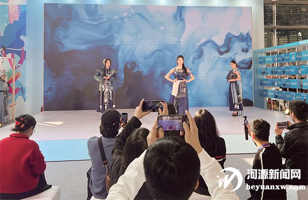 在“百万英才汇南粤”秋季大型综合招聘会现场的推介活动中,“古韵新织·蓝耀河源”河源墩头蓝非遗时装秀惊艳展馆,模特们身着墩头蓝服饰缓步前行,西装、长裙、披风……现代设计语言与非遗工艺交织相融,生动诠释河源文化传承中的创新活力。