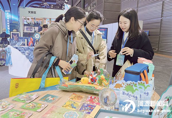 展馆内,以墩头蓝纺织技艺为灵感创作的服饰、团扇、玩偶等文创产品整齐有序地摆放在展架上,吸引了众多参观者的目光。文创产品在传统与现代交融中,成为讲述河源文化故事的生动载体,让参观者在方寸之间触摸到河源城市非遗传承的温度与创意焕新的活力。另一个展架上,“四小龙”系列文创与万绿湖主题文创产品静列其中,设计精巧的恐龙玩偶憨态可掬,印有卡通恐龙形象的水杯与包包简约清新,瓷器与镜子在灯光下泛着温润光泽,让不少参观者直呼想带回家。