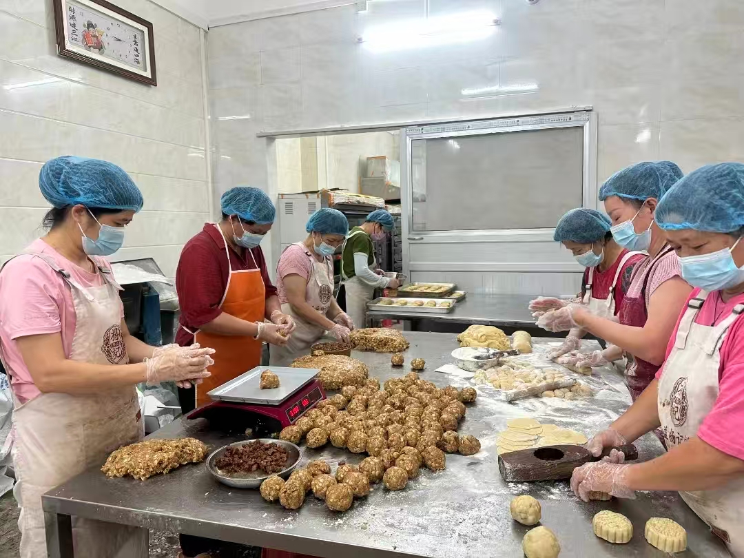 为应对激增的中秋订单,赖天生带领团队加紧赶制月饼——包馅、压模、烘烤,车间内香气四溢,每一道工序都有条不紊地进行。金装五仁叉烧皇、双黄白莲蓉等经典口味的月饼颇受欢迎。一位特地从深圳回来买月饼的郑先生说:“非遗月饼又香又脆,味道很好,打算买十几盒,送给亲戚朋友。”