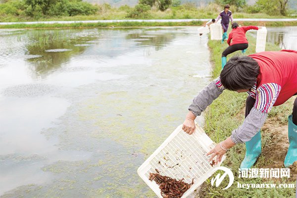 工作人员将虾苗投放至水田。