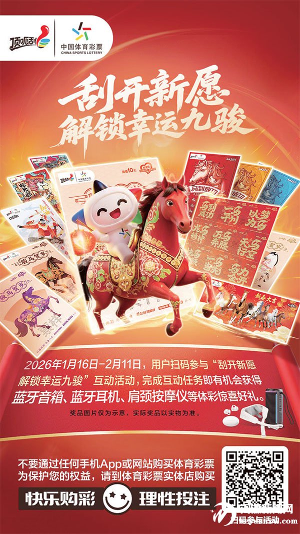 为了让新春的仪式感拉满,给大家增添乐趣与惊喜,体彩特别推出“刮开新愿解锁幸运九骏”H5活动,与你云端共度欢乐时光。9关趣味游戏乐趣爆棚,每一关都藏着不一样的惊喜体验。活动期间每三天解锁一关,让你在整个新春季期间的不同阶段拥有多种丰富的游戏体验。还可以参与抽奖,蓝牙音箱、蓝牙耳机、肩颈按摩仪、便携餐具、咖啡杯、冰箱贴、顶呱刮体验券(广东)等超多新春好礼已备好。活动将持续至2月11日,详情可关注“广东体彩”微信公众号或扫描右图海报二维码参与。