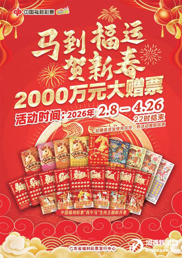 本报讯 记者 吴心怡 通讯员 赖小龙 金马报喜,福彩送福!为弘扬春节文化,传递美好祝福,广东省福利彩票发行中心自2026年2月8日0时至4月26日22时在全省范围(不含深圳)开展“马到福运贺新春”赠票营销活动。本次活动共安排2000万元赠票资金,如活动期间赠票资金提前使用完毕则活动结束,广东省福利彩票发行中心将向社会发布活动结束公告。