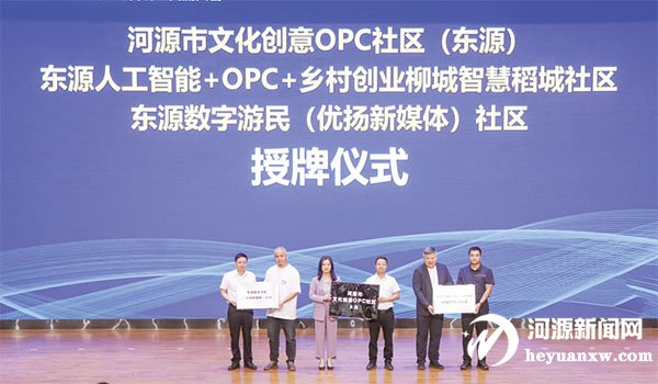 大会现场,河源市文化创意OPC社区(东源)、东源人工智能+OPC+乡村创业柳城智慧稻城社区、东源数字游民(优扬新媒体)社区,以及此前已完成揭牌的创客优品IP孵化园四大核心场景集中授牌运营。