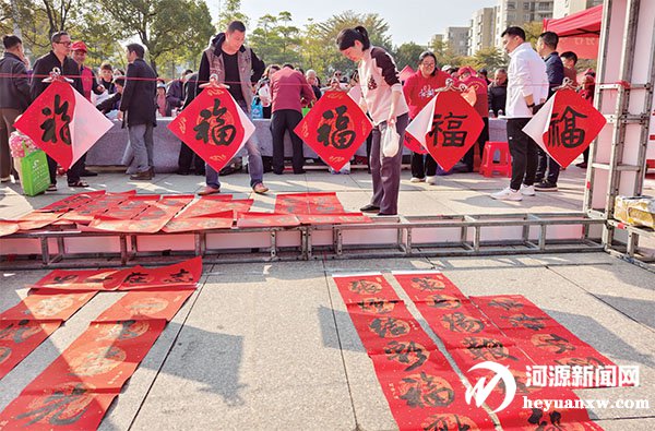 活动现场,市民们纷纷领取对联纸,挑选心仪的对联内容,排队等候书法家书写。多名书法名家与书法爱好者铺纸、润笔、蘸墨、挥毫,不一会儿,一句句新春祝福语便跃然纸上,市民们看着一副副喜庆的春联和一个个红火的“福”字,脸上洋溢着灿烂的笑容。待春联书写完毕,市民纷纷将春联铺在地上等待墨迹晒干,广场上充满浓浓的墨香,红彤彤的对联纸将河源衬得年味十足。