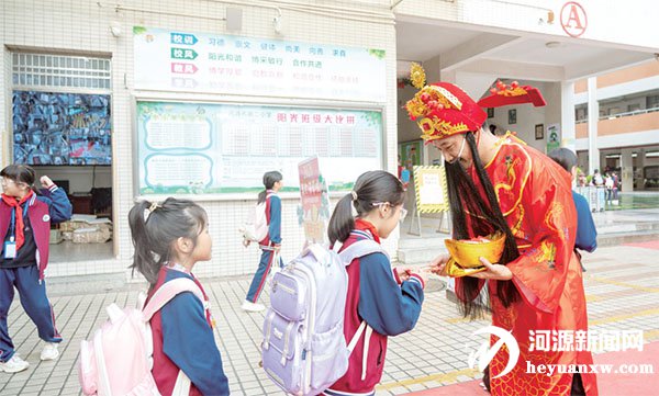 河源市第二小学的教职工化身“财神”迎接返校学子。