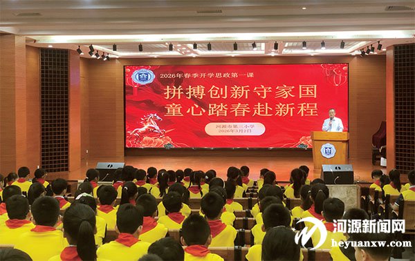 “同学们,春天是万物生长的季节,也是我们乘风破浪、扬帆起航的起点。”在河源市第三小学“思政第一课”上,该校党总支书记赖国勇寄语学生在2026年的春天里种下希望的种子,用努力和汗水浇灌,在新学期里收获满满的成长,奔赴属于自己的美好未来。而该校校长游玉文则从品德、学习、健康、志向四个维度出发,勉励全体学生要修德向善,做文明有礼的小榜样;要乐学善思,做勤奋求知的小骏马;要强健体魄,做平安健康的小卫士;要心怀家国,做追梦奋进的小先锋。