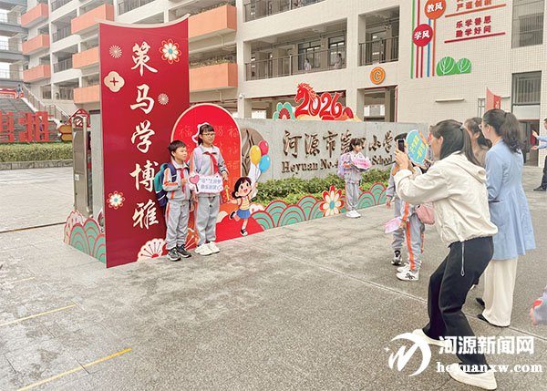 当天上午8时许,记者在河源市第四小学校门口看到,以“策马学博雅雅正育少年”为主题的展板矗立在校门正中,“新学期新气象”“龙马精神”等手持小牌子成为家长和学生拍照留念的热门道具。不少家庭全家总动员,在快门声中定格新学期的第一张笑脸。走进各班教室,个性化的开学班级活动正在上演,有的班级开展“‘马上’回顾”分享会,学生们纷纷举手上台畅谈寒假中印象深刻或有趣的事情;有的班级发放“新学期目标卡”,引导学生立足实际,设定短期与长期目标;还有的班级,班主任给学生分享关于马年的趣味小知识,以及开展与“马”有关的趣味文字游戏。各班班主任还结合学科特点,融入安全教育、习惯养成、规则教育与心理调适内容,帮助学生平稳度过开学适应期。